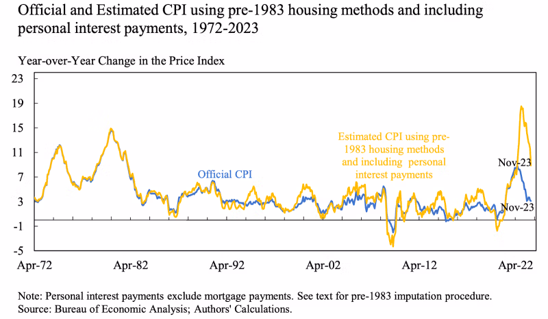 Dis 'n belangrike deel van wat gestyg het, en daarom toon data oor spesifieke nywerhede 'n groot gaping (kruideniersware styg met 35% oor vier jaar) en waarom ShadowStats ramings inflasie in dubbelsyfers vir twee jaar agtereenvolgens, na 'n hoogtepunt van 17%. Net rente bygetel, 'n referaat van NBER. ramings, neem 2023-inflasie tot 19%.