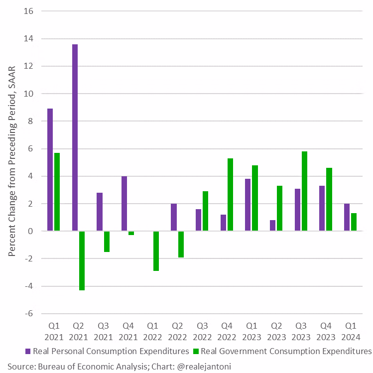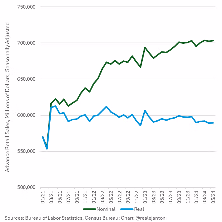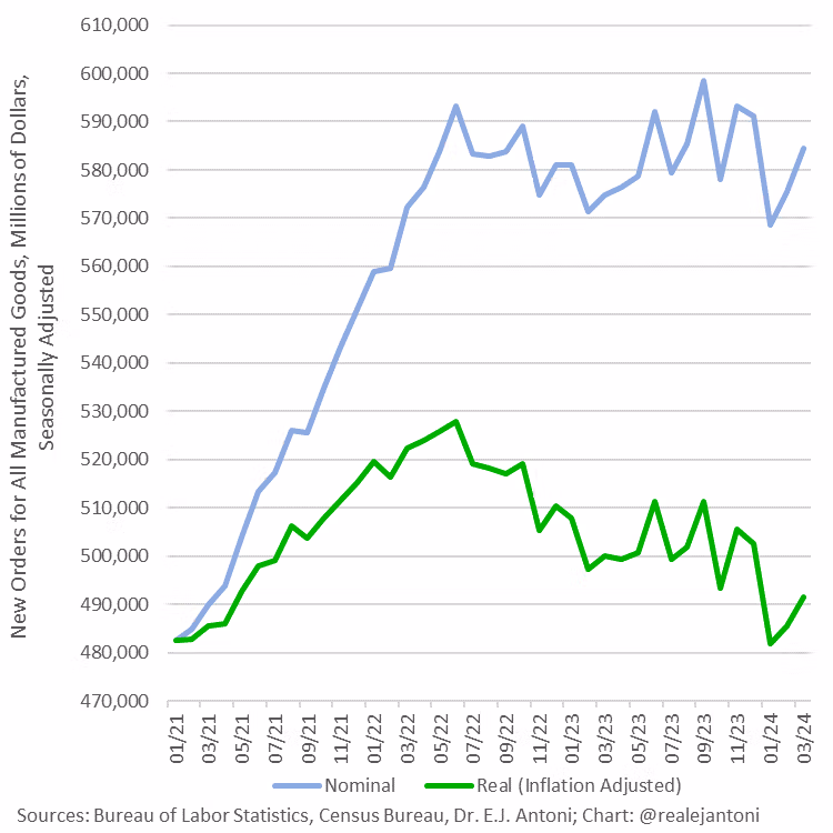 Soos EJ skryf: “Dit is fabrieksbestellings voor en na aanpassing vir inflasie: wat lyk soos 'n toename van 21.1% van Januarie '21 tot Maart '24 is slegs 'n toename van 1.8% – die res is net hoër pryse, nie meer fisiese goed nie; nog erger, werklike bestellings is 6.9% laer sedert hul hoogtepunt in Junie '22.”