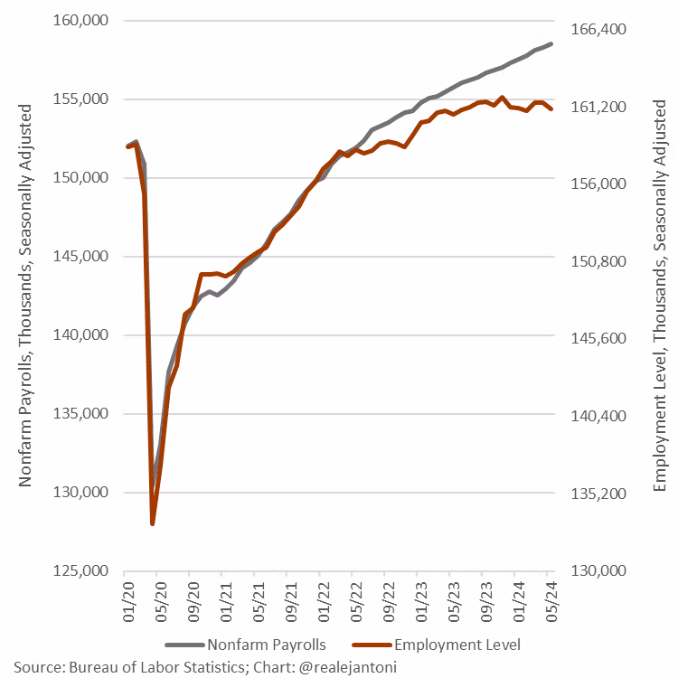 Die probleme met die werksdata word al hoe meer bekend. In wese is die vestigingsdata wat normaalweg gerapporteer word dubbeltelling of bloot onakkuraat, en daar is 'n groot verskil met die ander metode om werksgeleenthede via huishoudelike opnames te tel. EJ weer. aanbiedinge hierdie voorkoms.