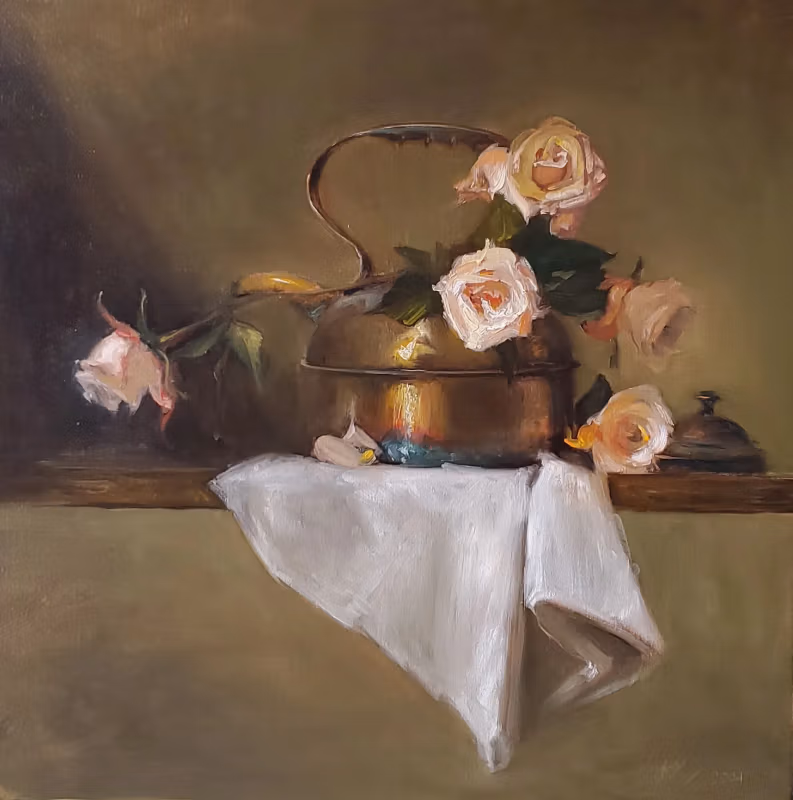 Kuns vir vandag: Stillewe met 'n teeketel, olie op linne 20×20 duim.