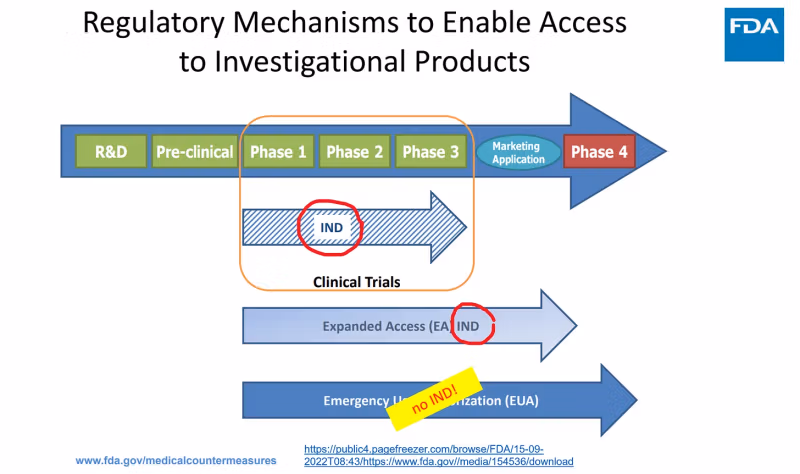 Daarom is mediese eksperimente wettiglik nie moontlik vir die EUA-dinge nie as gevolg van hul "nie-ondersoekende" status. Indien 'n produk nie ondersoekend kan wees nie, daar is geen proses vir die samestelling van die regulatoriese bewyse van veiligheid, doeltreffendheid en vervaardigingsbeheer vir voldoeningsdoeleindes nie. met Artikel 351(a) van die Wet op Openbare Gesondheidsdienste (PHS-wet), (42 USC 262) en cGMP (artikel 501(a)(2)(B) van die FD&C-wet (21 USC 351(a)(2)(B)) en 21 CFR Dele 210, 211 en 610).