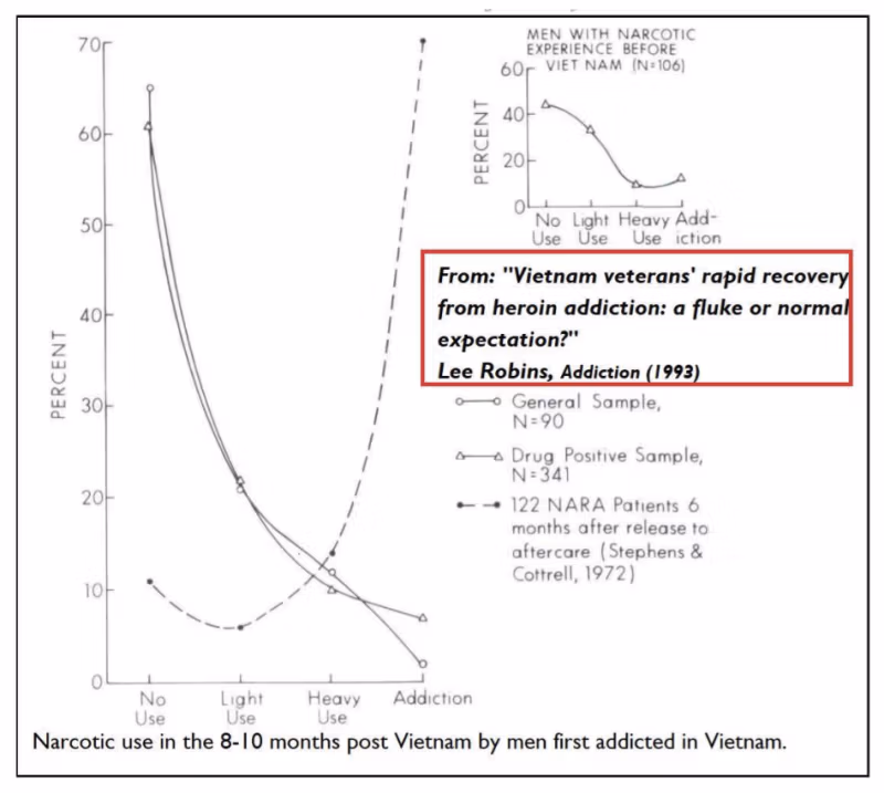 Die regverdiging vir hierdie stelsel berus gedeeltelik op 'n mite. Beleidsmakers het beweer dat Viëtnam 'n generasie heroïenverslaafde veterane opgelewer het wat lewenslange behandeling benodig. Maar sielkundige Lee Robins se 1974-studie het die teendeel bevind: 34% het heroïen in Viëtnam gebruik, 20% het aan afhanklikheidskriteria voldoen – maar slegs 1% het verslaaf gebly nadat hulle huis toe gekom het. Hulle het herstel deur werk, huwelik, verantwoordelikheid – nie klinieke nie. Washington het die veerkragtigheid geïgnoreer en metadoonklinieke in elk geval massief befonds.